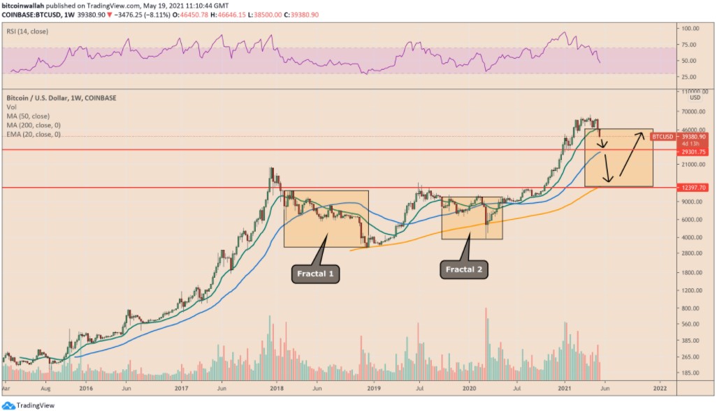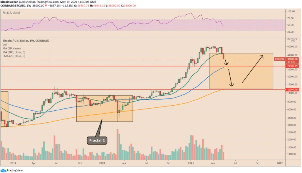 Chỉ riêng các fractal kỹ thuật đã cho thấy rằng giá bitcoin có một đợt điều chỉnh giảm kéo dài đối với đường SMA 50 tuần (sóng xanh trong biểu đồ ở trên). Tại đây, tiền điện tử hàng đầu sẽ có xu hướng test sóng SMA 50 tuần để tìm pullback.