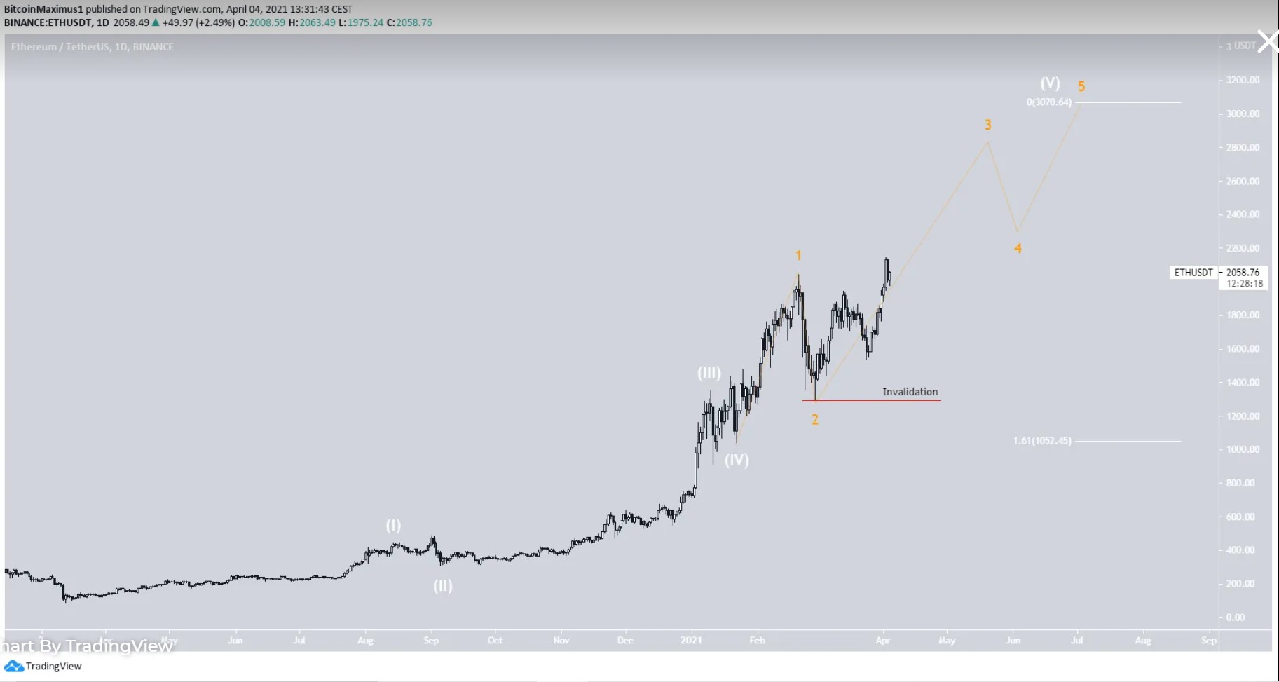 Số lượng sóng cho thấy ETH đang ở trong 5 sóng dài hạn (màu trắng) của một xung động tăng giá bắt đầu từ tháng 3 năm 2020.