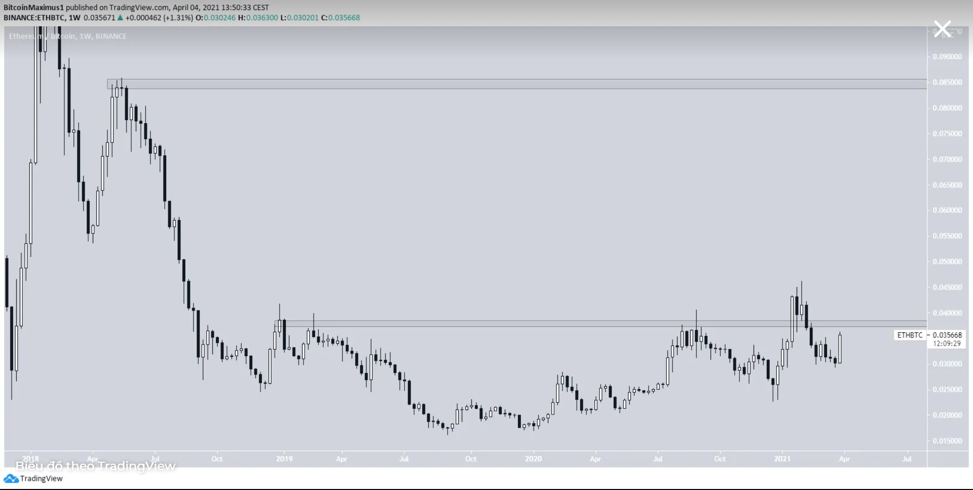 Biểu đồ hàng tuần cho thấy rằng mặc dù hiển thị mức tăng hiện tại, tài sản vẫn đang giao dịch dưới vùng kháng cự 0.038 BTC. Ngoại trừ sự sai lệch nhỏ vào tháng 2, vùng kháng cự đã có từ cuối năm 2018.