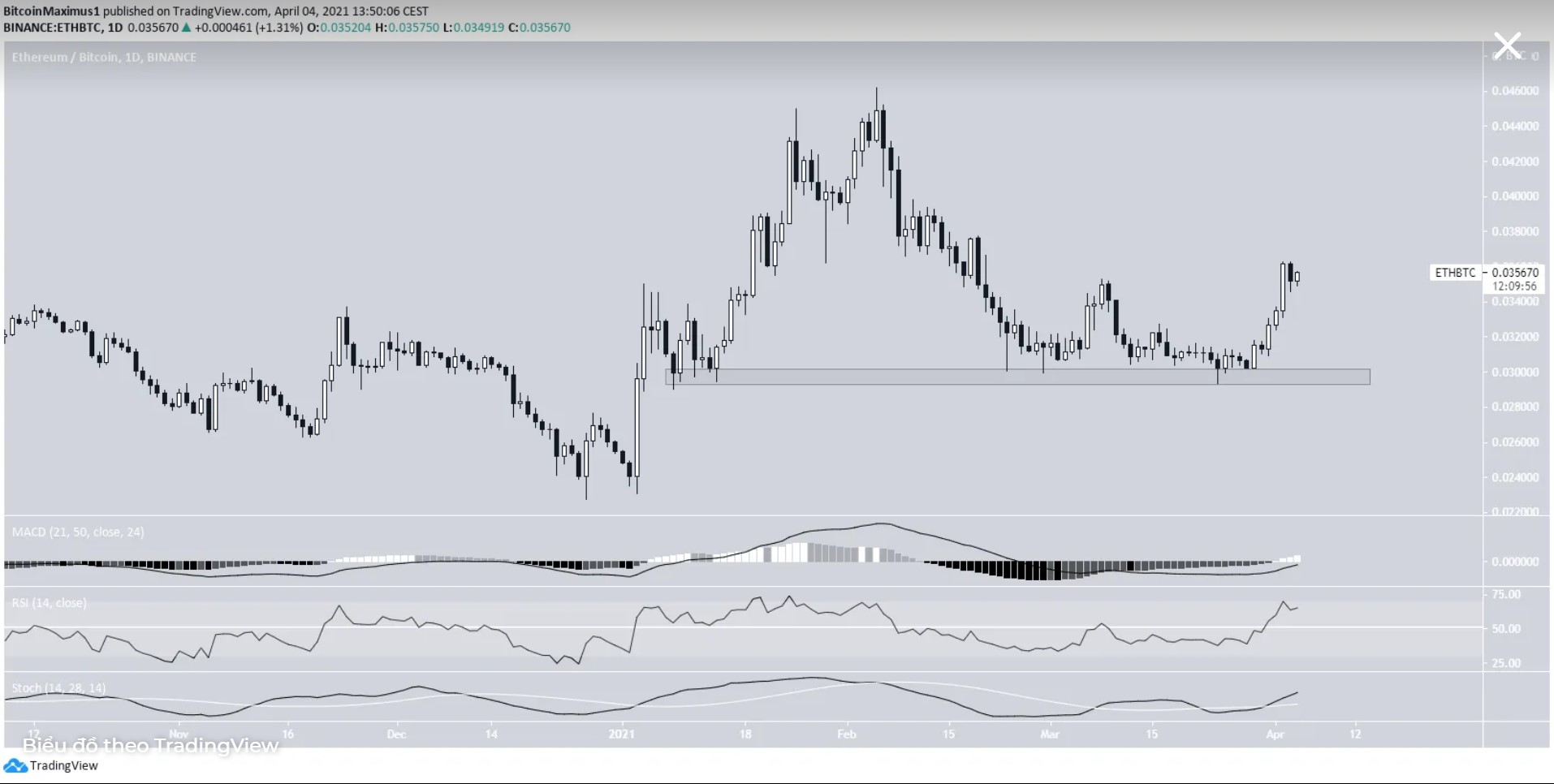 Biểu đồ hàng ngày cung cấp triển vọng tăng giá hơn. ETH đã bị trả lại ở khu vực 0.03 BTC và đang di chuyển lên trên.