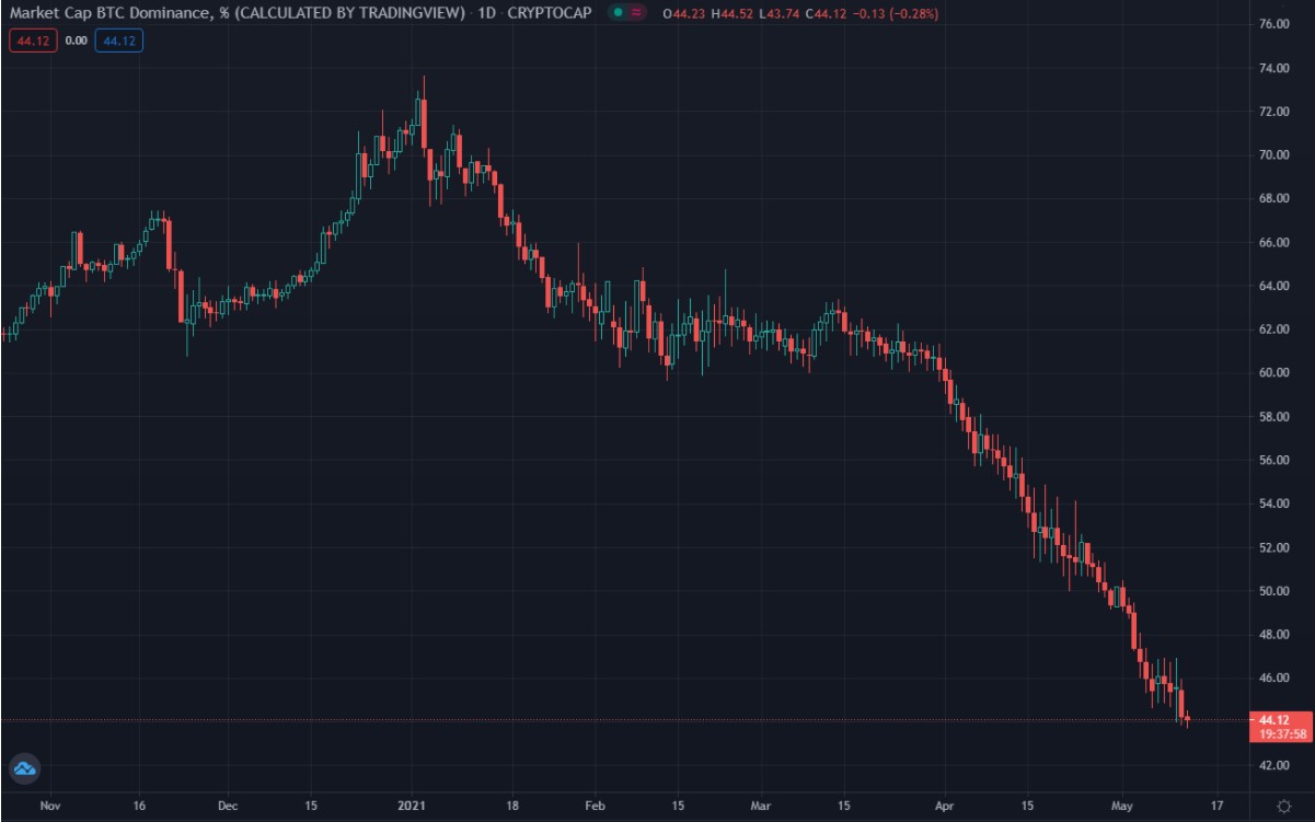 Đà tăng mới nhất của Ether tiếp tục phá vỡ sự thống trị của Bitcoin khi thị phần của “nhà vua” hiện đã giảm xuống chỉ còn 44% từ gần 74% vào đầu tháng Giêng.